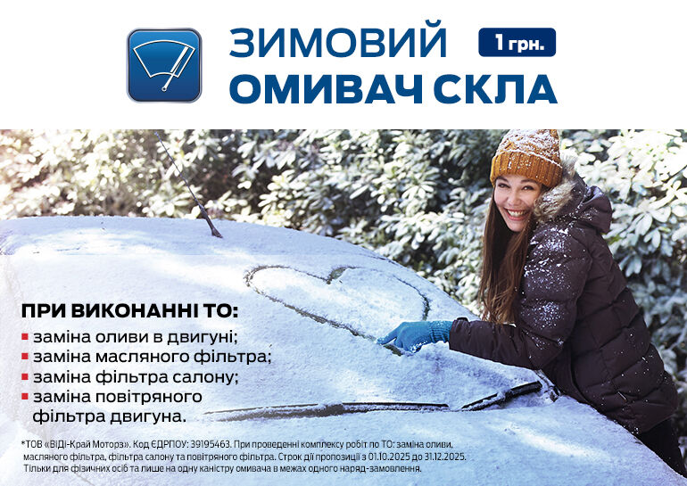 Водії вже активно почали обирати зручний час і записуватися до нас за Зимовим омивачем скла за 1 грн.* Подбайте і ви про власний автомобіль, записуйтесь вже зараз на сайті або ж за телефоном та приїздіть на сервіс Форд ВІДІ Край Моторз!